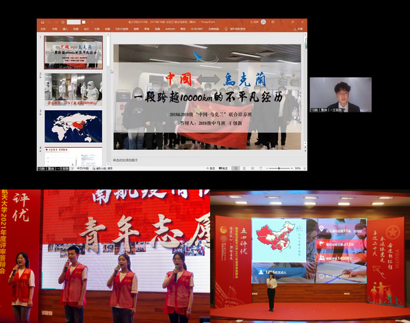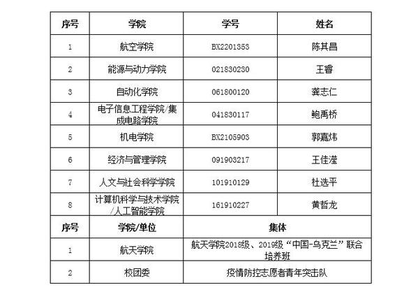 根据综合评比情况,航空学院陈其昌、能源与动力学院王睿等8人获评2021年度十大杰出青年学生,航天学院2018级、2019级“中国-乌克兰”联合培养班、校团委疫情防控志愿者青年突击队获评2021年度十大杰出青年学生集体。