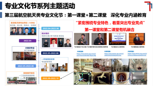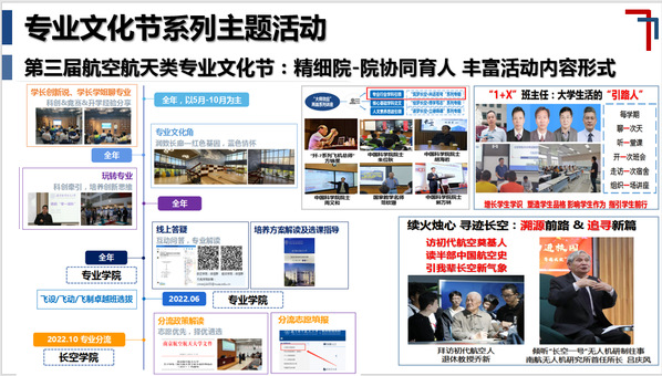 本次航空航天类专业文化节,将进一步精准构建第一课堂,《航空航天类专业导论》继续由学科带头人姚卫星等担任主讲教师,进一步加强教学内容的重构融合与专业边界的再设计,确保课程运行成效;进一步精细院院协同对接、加强校企互通,邀请专业学院领导、学术带头人、青年教师、企业知名校友、专业学院退休教师等与同学深入交流,真正实现“全员、全方位、全过程”协同育人;将丰富活动内容形式,在以往的“大咖谈专业、线上逛专业、学长聊专业”主题活动基础上,新增“寻迹长空”、“院长有约”、“玩转专业”、“专业文化角”、“企业校友专场”、“学长创新说”等特色主题活动拓展专业文化节的内涵与外延,将进一步创新活动形式,各场主题报告首次采用以长空学院智慧教育空间为活动载体,采用以7109小报告厅为主会场,其他智慧教室分会场直播的“准线下”的举办形式,实现700余名21级长空学院学生全参与、全覆盖。