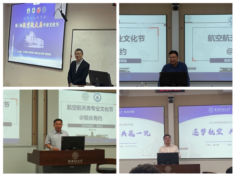 5月第一周,由长空学院常务副院长蒋彦龙出席专业文化节启动仪式并开讲首场“院长有约”系列活动。蒋彦龙从航空航天“学科边界广、交联模块多、技术迭代快、环境条件苛刻、系统复杂度高”的行业特征谈起,介绍了进行航空航天类大类招生、大类培养的缘起和目的,以及在“2+2”模式下进行的航空航天类“新工科”教育与模式的探索和实践;还从专业教师角度出发谈了“飞环”专业内涵前景及优势特色。能源与动力学院院长毛军逵,从航空发动机事业的过去、现在和未来谈起,重点介绍了能动学院“服务我国航空航天动力自主可控的重大国防需求,引领我国能源领域基础研究的创新发展”的使命担当,详细阐释了飞行器动力工程专业“气、固、热、控、实践”为特征的专业特色,他表示选择飞行器动力工程专业必将大有前景、大有可为;机电学院院长傅玉灿从“manufacture”的英文内涵、近现代制造业历史演进和当前中国制造的国际局势及内外部环境展开,指出发展高端装备制造,特别是航空航天装备制造,是我国成为制造强国战略的必然选择,期望同学们为航宇制造奉献力量;航空学院院长魏小辉,以“逐梦航空,共筑一流”为主题,讲述了学院的文化内涵和历史底蕴,重点介绍了力学、航空宇航科学与技术学科的交叉融合发展及人才培养情况,欢迎同学们投身飞设、飞环事业。各专业学院院长从不同的切入点,充分展示了各学院的红色基因、学科的深厚底蕴和专业的独特魅力,不仅为同学们进行了内容全面、知识精炼、站位高远、思想深刻的专业认知教育,更是学校课程思政教育的生动实践。