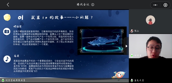 首先,刘京京从世界战场上武装直升机的优秀战绩出发,向同学们简单介绍了武装直升机的研制难度,进而引出吴希明总师对武直十的研究过程。当他展示出南航校内武直十真机图片和直升机降落南航的视频时,同学们都投来了兴奋的目光。有小朋友提出了“直升机为什么要有两个螺旋桨”的问题,刘京京以竹蜻蜓进行类比,用浅显易懂的话语解释了直升机尾桨的重要作用。并且,刘京京对他表示了表扬并鼓励他保持好奇心,未来考入南航,投身于祖国的航空事业。