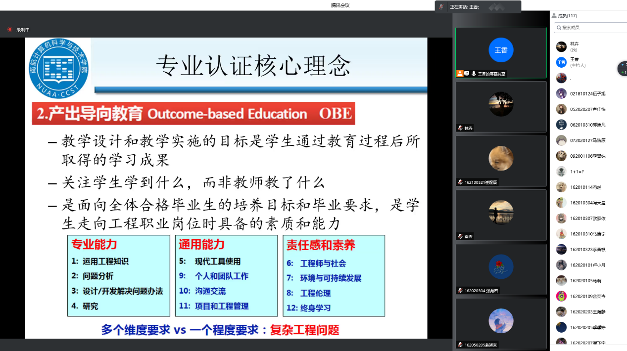 5月5日,计算机科学与技术学院/人工智能学院举办青年学者午间沙龙,专题研讨工程教育专业认证,学院院长陈兵和长空学院副院长孙涵两位工程教育认证专家作主题报告。本次活动吸引了全校近50名青年教师现场参会,近120名青年教师和学生线上参会,气氛热烈。活动由院长助理、学院青联会长赵彦超老师主持。