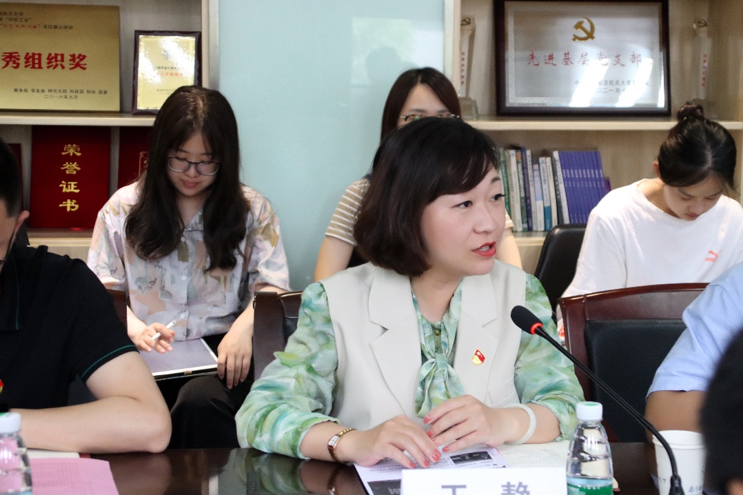 王静首先领学了习近平总书记在中国人民大学考察时的重要讲话、给中国航天科技集团空间站建造青年团队的回信以及在庆祝中国共青团成立100周年大会上的讲话精神。她从总书记近年来在重要时间节点对青年工作、教育工作、思政工作的具体要求出发,梳理了总书记讲话的精神脉络和所引典故,并以“振奋、坚定、自信”三个关键词分享了自己的学习心得与体会。王静表示将以习近平总书记重要讲话精神为根本遵循,团结引领南航青年感党恩、听党话、跟党走,不断增强南航共青团的引领力、组织力、服务力和大局贡献度。
