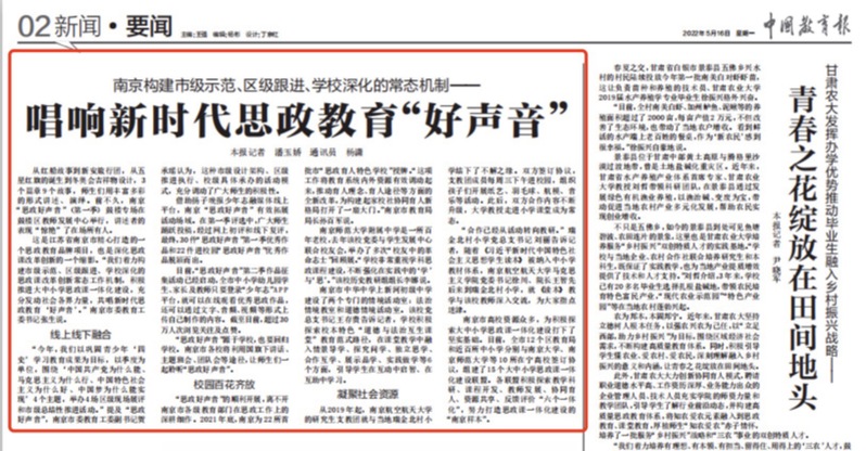 近日,《中国教育报》以《南京构建市级示范、区级跟进、学校深化的常态机制——唱响新时代思政教育“好声音”》为题报道了南京市思政教育品牌项目——《唱响新时代思政教育“好声音”》。南京市着力构建市级示范、区级跟进、学校深化的思政课改革创新常态工作机制,积极推进大中小学思政课一体化建设,充分发动社会各界力量,共唱新时代思政教育‘好声音’。文章从“线上线下融合”、“校园百花齐放”和“凝聚社会资源”三方面详细介绍了这一工作机制。