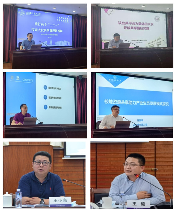 在工作交流环节,我校国有资产管理处副处长阎志军、南京理工大学国有资产与实验室管理处副处长石磊、南京农业大学实验室与基地处副处长田永超等分别围绕大型仪器共享管理机制探索、公共平台建设、绩效考核体系构建与结果运用等作专题报告。南航秦淮创新湾区办公室副主任许爱华则从校地企三个方面介绍了南航秦淮创新湾区在打通校地资源共享、助力产业生态发展模式方面所做的工作。
