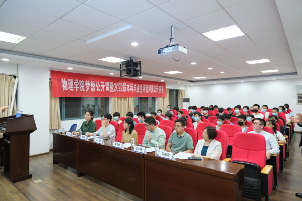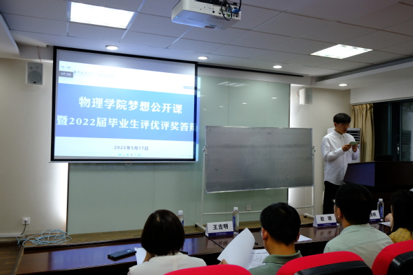 5月下旬,物理学院梦想公开课暨2022届本科毕业生评优评奖答辩在理学楼217报告厅举行,物理学院副院长李晋斌、党委副书记欧珊,教师代表王吉明、马海霞,辅导员胡诗帆、邢临川作为评委参加此次答辩,学院2021级本科生到场学习观摩。