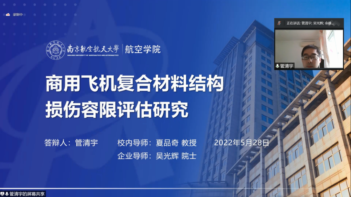 5月28日,我校历史上首篇工程博士学位论文顺利完成了线上答辩,标志着我校工程博士培养实现了从0到1的突破。该篇工程博士学位论文的作者是我校航空学院2018级工程博士生、中国商飞复合材料中心专业技术部疲劳与损伤科室主任、高级工程师管清宇,指导教师是我校航空学院博士生导师夏品奇教授,企业导师是中国工程院院士、中国商飞C919大型客机总设计师吴光辉教授。