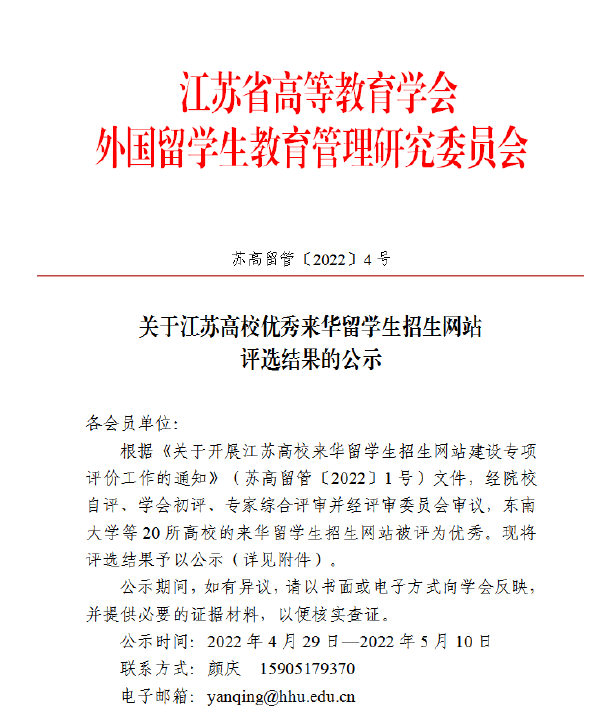 近日,江苏省高等教育学会外国留学生教育管理研究委员会正式公布了江苏高校优秀来华留学生招生网站评选结果,我校国际教育学院主持建设的来华留学生招生网站被评为“江苏高校优秀来华留学生招生网站”。根据《关于开展江苏高校来华留学生招生网站建设专项评价工作的通知》(苏高留管【2022】1号)文件,该评选活动历经院校自评、学会初评、专家综合评审及评审委员会审议等环节,最终全省有20所高校的来华留学生招生网站被为优秀。