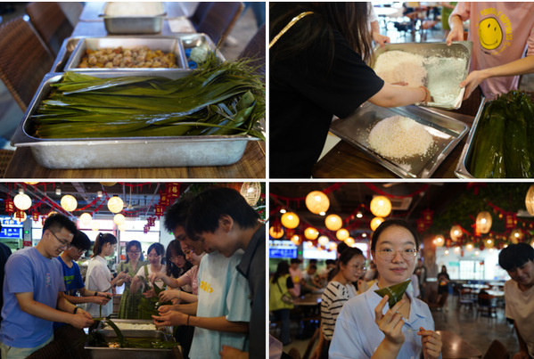 为了庆祝端午佳节,同学们走进馨园食堂,在食堂阿姨的教学指导下,围坐在一起折粽叶、装糯米、放馅料、裹扎绳,只消半个小时,粽叶、糯米和蜜枣便完成了合体,化作了一个个可爱的小粽子。在此过程中,师生之间还交流分享了来自全国各地不同的端午习俗,在和谐的氛围中一同感悟传统文化魅力。