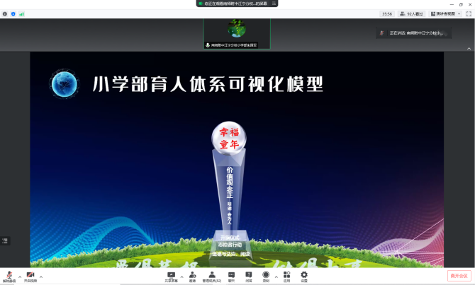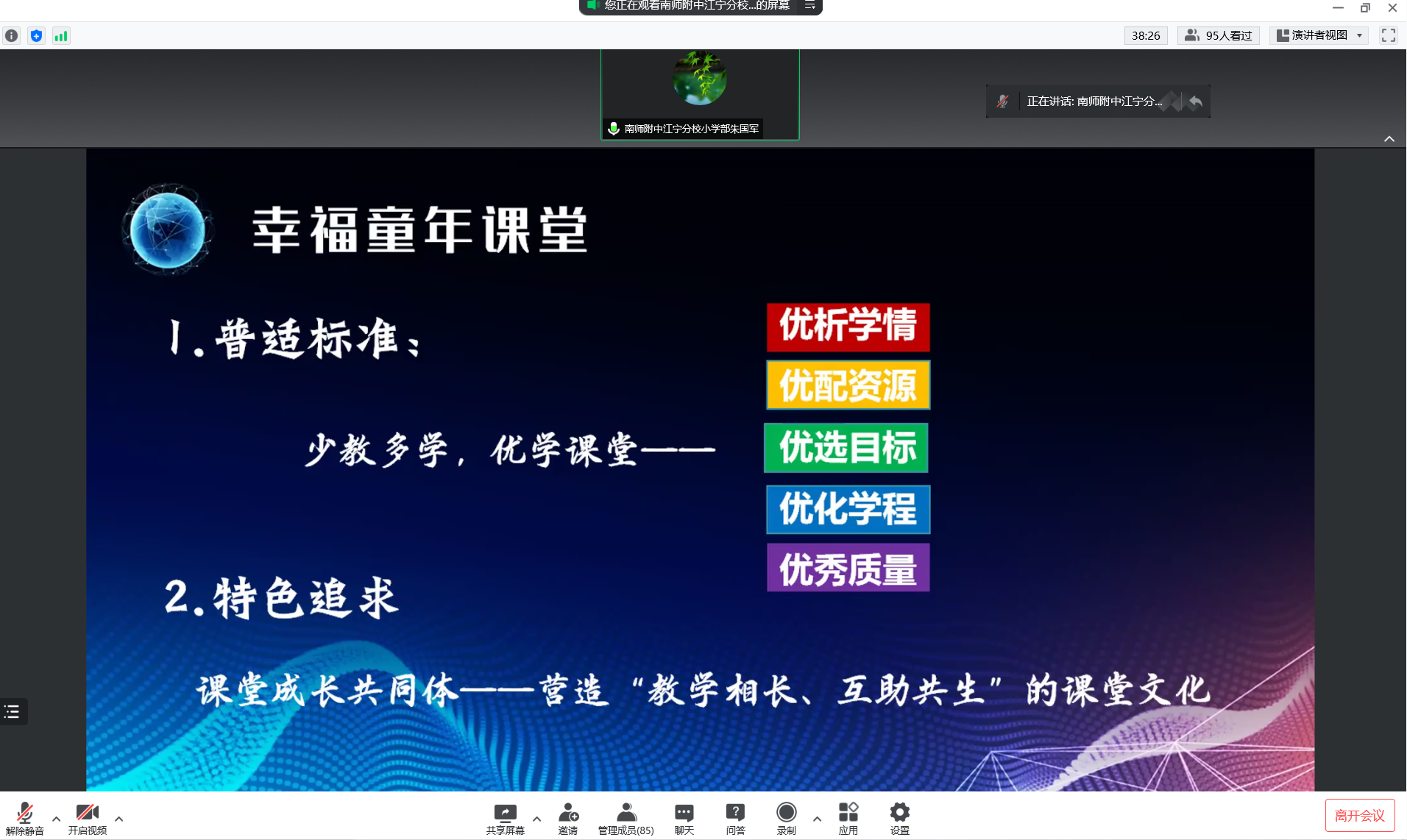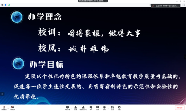 张庆致欢迎辞。朱国军为我校教师教师介绍了南师附中江宁分校的办学理念和办学目标。李冉详细讲解了学校的课程特色与特色课程。邢茜为众多青年老师们进行了在线答疑。
