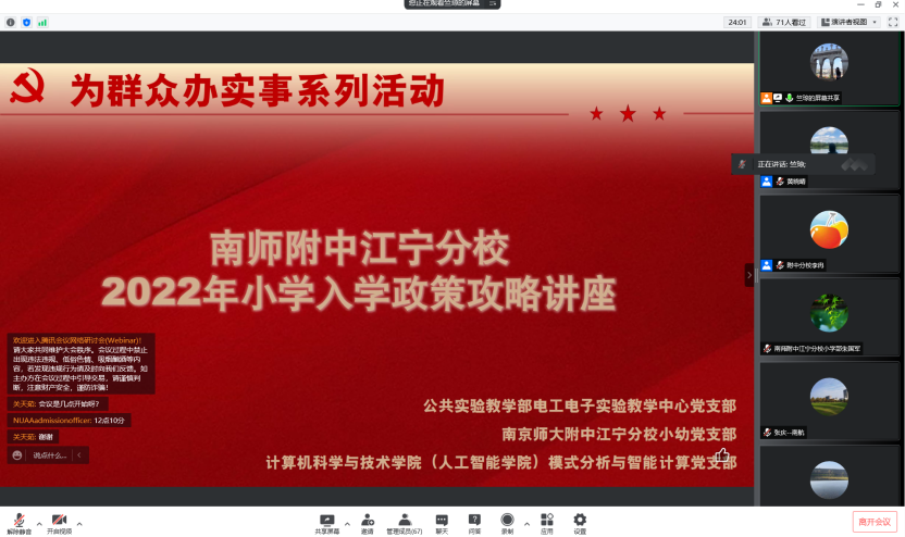 2021年5月30日,公共实验教学部电工电子实验教学中心党支部、计算机科学与技术学院/人工智能学院模式分析与智能计算所党支部、南师大附中江宁分校小幼党支部联合举办了“我为群众办实事”之南师附中江宁分校2022年小学入学政策攻略在线讲座。公共实验教学部党总支书记张庆、南师附中江宁分校小学校长、小幼支部书记朱国军、小学部招生办主任邢茜、小学综合保障办主任李冉、我校电工电子实验教学中心支部书记竺琼、计算机科学与技术学院/人工智能学院模式分析与智能计算所党支部冯爱民出席该讲座,我校近百名教师参与了此讲座。