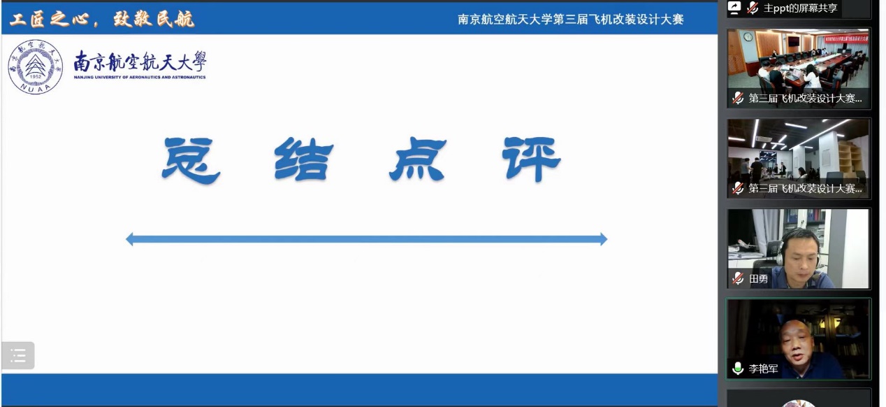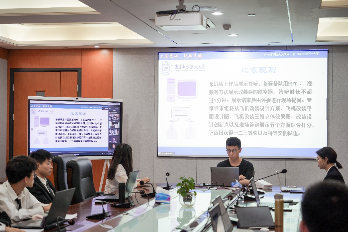 6月10日晚,我校第三届飞机改装设计大赛决赛于天目湖校区民航学院科创空间和将军路校区民航学院1213会议室同步进行。根据疫情防控的要求,本次比赛采用线上线下相结合的答辩方式。波音公司波音研究与技术部客舱技术研究员龙珑女士,中国民航局结构委任工程代表、山东太古高工赵伟岩先生,中国民航局系统和设备委任工程代表、山东太古高工宋青女士,民航学院党委副书记王艳、副院长田勇,工程系主任丁萌、教授李艳军、副主任宫淑丽、教师曹愈远以及民航学院团委书记赵慧文和学生代表共同参与此次大赛。