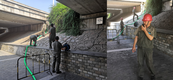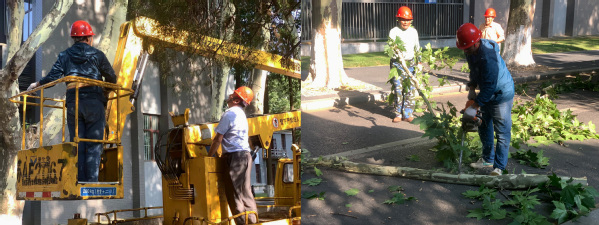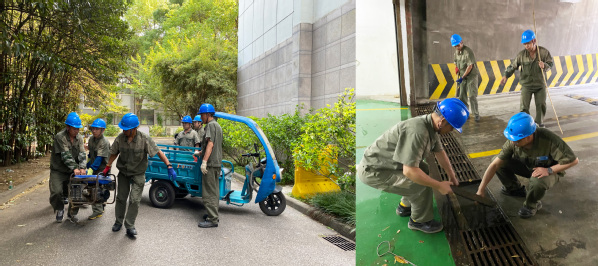 应急演练演示了从启动应急预案到现场指挥救援、设立标志、清理台风吹折的树干、疏通道路和地下室积水、搭建积水区域出行通道、抢修台风吹折的路灯、物资保障等各个可能突发环节的实操演练,并迅速排除险情。