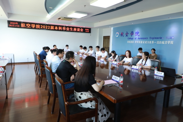 6月17日下午,航空学院“逐梦航空 相约未来”2022届本科毕业生座谈会在18号楼511会议室召开。院党委书记袁智强,院长魏小辉,院党委副书记佘明,系所教师代表、班主任代表,院团委书记代澔丛,党政办张樱,辅导员、教务员以及毕业生代表们参加座谈会。会议由佘明主持。