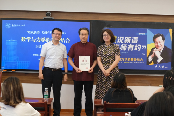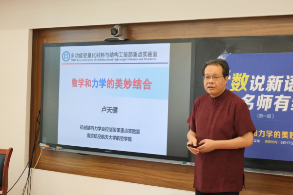6月17日,数学学院在理学楼519会议室举办第一期“数说新语,名师有约”讲座交流活动。国家级人才、多功能轻量化材料与结构研究中心主任、航空学院教授卢天健做了题为《数学和力学的美妙结合》的专题讲座。数学学院党委书记许静、院长王春武、院党委副书记周佼佼、辅导员以及数学学院、物理学院约40名同学参加活动。活动由周佼佼主持。