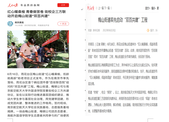 6月16日,外国语学院师生赴南京雨花区梅山街道开展“双百共建”活动,梅山街道党工委书记陈志新、办事处主任李文浩、党工委副书记杨镇宁,梅钢公司统战部部长苏潜、团委书记徐立立,外国语学院党委书记左彤云、校团委副书记赵铮、学院党委副书记梁薇参加了此次活动。活动得到了人民日报平台、新华日报、南京晨报的宣传报道。