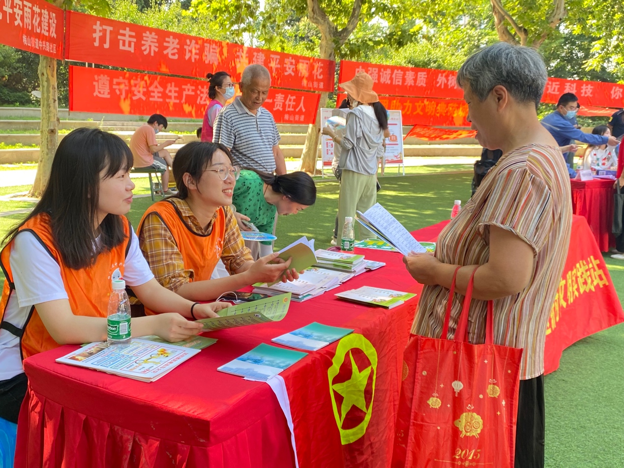 当天,在梅山街道公园里,学院2021级研究生团支部成员与梅山街道工作人员一起开展了便民志愿服务活动,为街道居民提供垃圾分类讲解、两会书单介绍、照片打印、防诈骗宣传等日常服务。