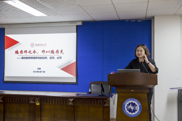 王晖围绕“德为师之本,师以德为先”主题,从高校教师师德师风的应然、实然、必然三个维度,结合教师思想状况滚动调研结果和师德违规违纪相关警示案例,从宏观上阐述了国家对教师师德师风的要求,在微观层面上详细论述了近年来的新变化,揭示了全国高校师德师风普遍存在的问题,并具体分析了我校师德师风发现的问题,总结了加强师德师风建设工作的五个主要思路。报告深入浅出、内容丰富、通俗易懂,深化了与会人员对师德师风的理解和把握。