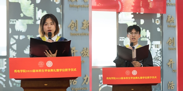 毕业生代表,工业设计专业苗雨欣同学、飞行器制造工程专业于浩然同学发言。他们表示,南航的四年大学生活,学院给予了他们认识自我、了解自我、成长自我以及展示自我的平台。未来,他们将铭记“卓越、融合、创新、开放、活力”的院训,直面属于他们的时代, 承担起伟大祖国与伟大人民所赋予的责任。