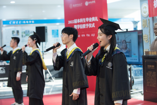 随后,毕业生代表带来合唱《凤凰花开的路口》,为机电学院2022届本科毕业生送上离别的美好祝福。优美而富有激情的旋律响起,典礼现场沉浸在离别时感伤又不舍的氛围。
