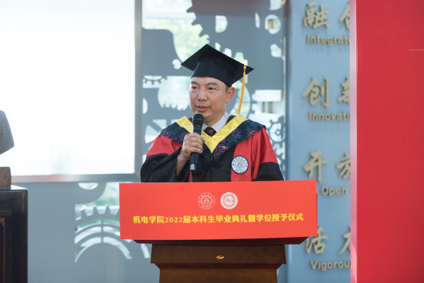 傅玉灿院长代表机电学院向圆满完成学业的2022届全体毕业生表示热烈祝贺。他表示,这是火热的一天,机电学院的学子们也将投入更加火热的学习工作中,在这个新的起点等待出发。长路漫漫,前程艰辛,坚定信念,奋力奔跑,加油向未来!