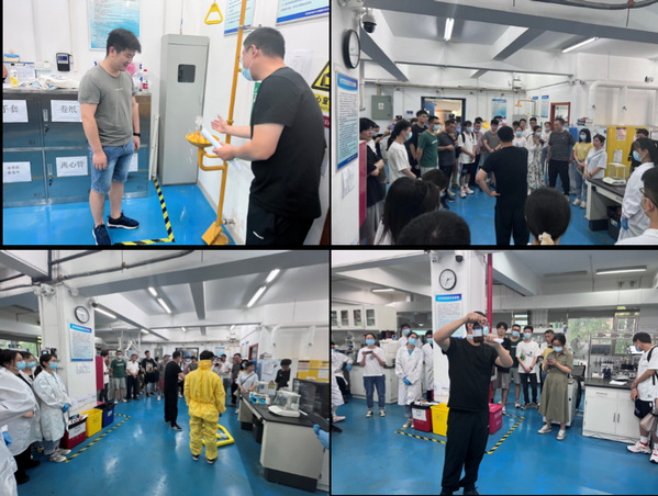 演练先后模拟了实验室内硫酸泄漏和硝酸被盗抢两类突发事件的应急处置。硫酸泄露事件的应急处置主要分为逐级上报、穿戴防护用品、使用吸附器材处理泄漏危化品、使用洗眼器或应急喷淋装置清洗伤口等环节,硝酸被盗抢事件的应急处置主要分为逐级上报、报警、启动校园安保等环节,在场师生“沉浸式”“真实”体验了处置的全流程。演练教员还讲解安全管理知识,如MSDS查阅、防护服穿着、防护设施使用等。