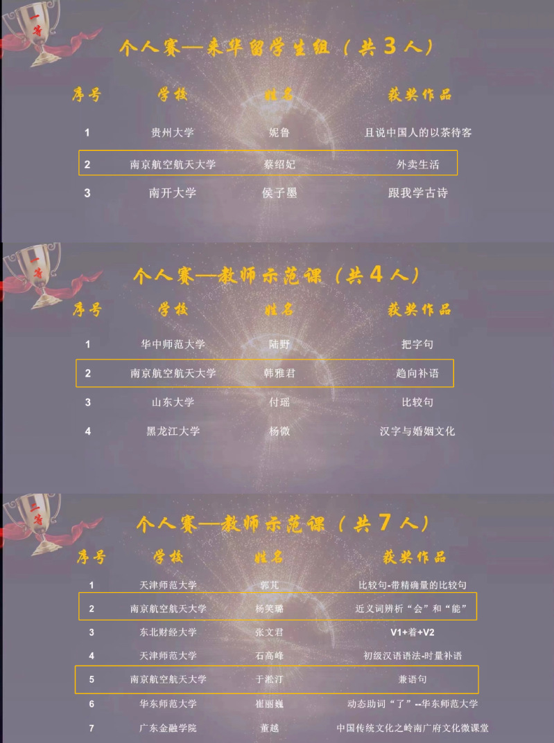 大赛由北京师范大学、上海大学及北京唐风汉语教育科技有限公司共同发起,参赛高校126所,提交作品1700余件。我校师生在大赛中取得优异成绩,共荣获6个奖项,其中,国际教育学院韩雅君荣获教师示范组个人赛一等奖、杨笑璐和于淞汀均荣获二等奖;马来西亚留学生蔡绍妃荣获来华留学生组一等奖、印度尼西亚留学生刘国煌荣获三等奖、圣多美和普林西比留学生马可荣获优秀奖。