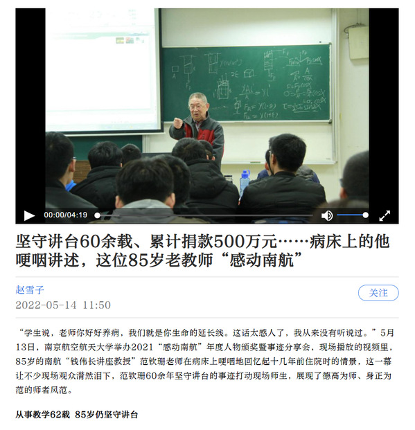 江苏广电荔枝网丨把教育教学当作毕生事业!这位85岁高龄老师“感动南航”