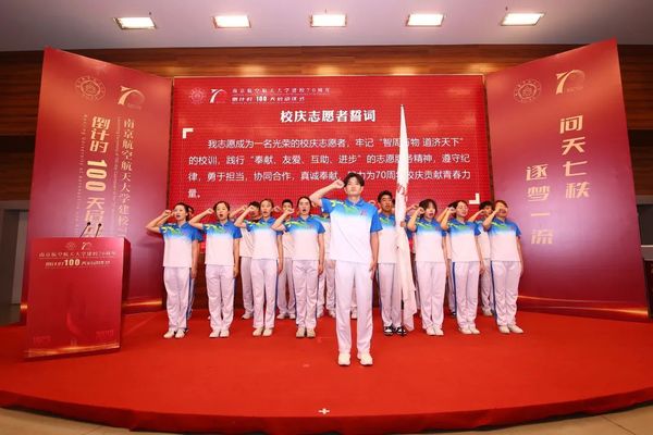 刘宇雷为校庆志愿者代表授旗,志愿者现场宣誓。学校于今天正式发布校庆志愿者招募通知,将成立由700名学生组成的志愿者团队。