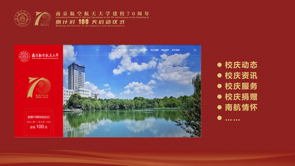 随后上线了建校70周年专题网站,通过校庆动态、校庆资讯、校庆服务、校庆捐赠、南航情怀等6个板块,展示校庆期间各项活动日程。