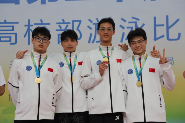 游泳接力赛是各个高校代表队综合实力的较量,也是最振奋人心的比赛项目。在男子4*100米自由泳接力比赛中,上场的运动员你追我赶,场下的观众纷纷加油呐喊,加油声此起彼伏。我校运动员洪茁棋、杨皓文、赵以宁、吴家杰在开场就稳定了绝对优势,并一路领先,最终夺得冠军。一个冠军团队的背后,一定有着一大群默默付出的人。接力赛冠军是场上和场下选手共同努力、相互凝聚的最好见证。