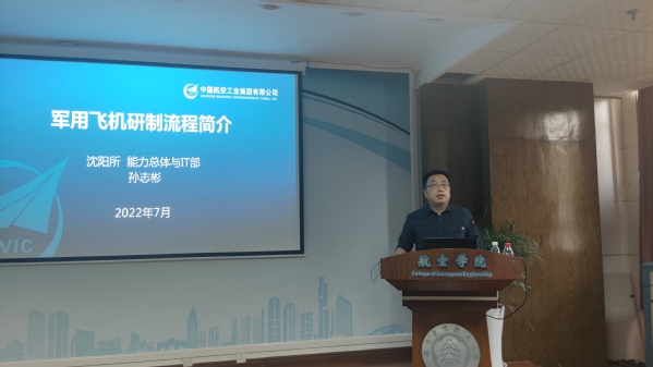 应我校航空学院飞行器先进设计技术国防重点学科实验室教授魏小辉邀请,沈阳飞机设计研究所能力总体与IT部副部长孙志彬研究员于2022年7月20日访问我校,并为我校师生做了题为“军用飞机研制流程简介”的学术报告。