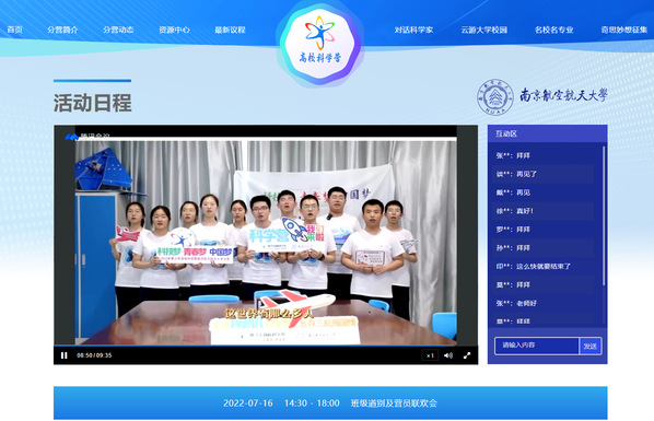 2022年青少年高校科学营南京航空航天大学分营于7月12日-17日“云端”开营,来自南京、无锡、镇江、南通、扬州、泰州、盐城、淮安、宿迁、徐州、连云港等11个江苏省内的130名高中生和13名带队老师通过“云上科学营”平台进入虚拟大学校园,共同参加此次科学营活动。此次分营活动由校团委主办、物理学院承办,得到了各相关职能部门和学院的大力支持,旨在培养青少年的科学精神、创新意识和实践能力,为培养科技创新后备人才打下坚实基础。