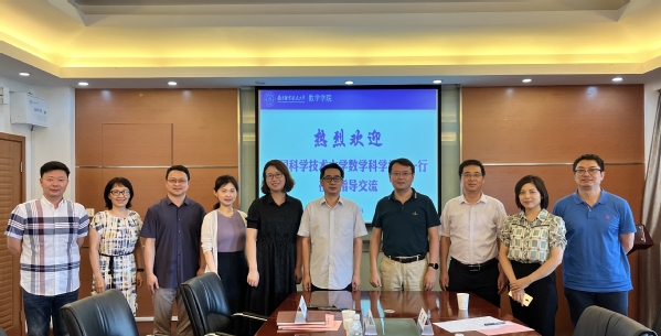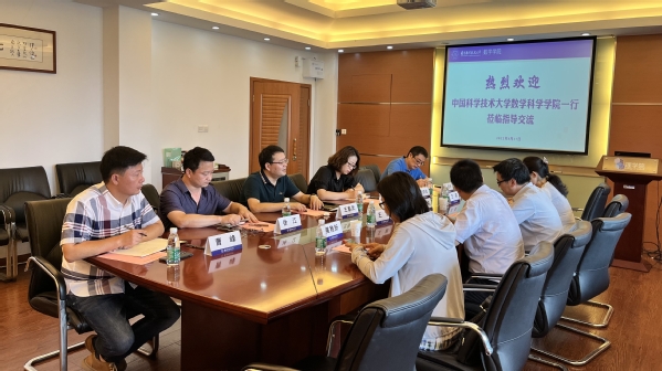 8月17日,中国科学技术大学数学科学学院党委书记、执行院长黄文,副院长王毅,党委副书记王莉,研究生教学部主任黄稚新到我校数学学院进行工作交流。数学学院党委书记许静、院长王春武、党委副书记周佼佼、副院长徐江、副院长蒋建林、数学系主任曹峰热情接待来访嘉宾并参加座谈交流。