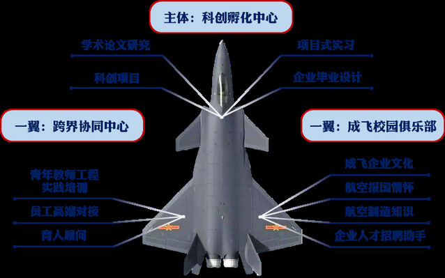 成飞-南航“智汇蓝天”科创孵化中心以大学生科创项目为载体,已连续六年征集来自成飞生产、设计、管理一线的研究问题面向南航师生发布,学生在校企“双导师”的指导下完成项目研究,形成了“企业出题、教师解题、学生做题”实践模式。逐步探索建立了“以科创孵化中心为主体,成飞校园俱乐部和跨界协同中心为两翼”的“一体两翼”式“智汇蓝天”校企协同育人新模式。