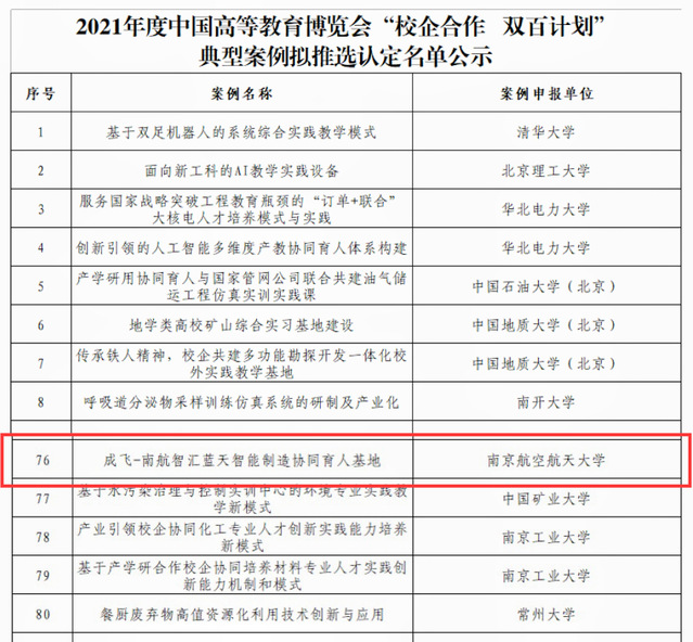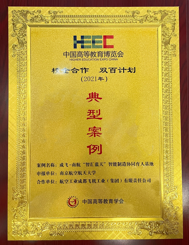此次高博会旨在深入学习贯彻习近平总书记关于教育工作的重要论述和2022年全国教育工作会议精神,探索产教融合协同育人机制,促进产教融合协同育人高质量发展。其中,“校企合作 双百计划”典型案例推选工作于2021年9月启动,经资格审核、网络盲审、线上线下双走访等环节,我校《成飞-南航智汇蓝天智能制造协同育人基地》项目被认定为2021年度“校企合作 双百计划”典型案例。此次是我校首次获此荣誉。
