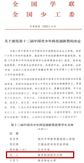 近日,共青团中央、全国青联、全国学联、全国少工委印发《关于颁发第十三届中国青少年科技创新奖的决定》。经过层层遴选,最终获奖者中共有小学生9人、初中生19人、高中生30人、大学生31人。我校航天学院2019级本科生刘上作为具有较强探索精神、实践能力和创新潜力的高校学生代表获得表彰,成为我校第五位获得该奖项的学生。这也是自2004年全国首设此奖以来,我校时隔八年再次摘得此奖项。