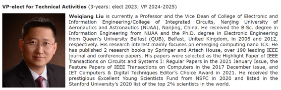 刘伟强教授现任南京航空航天大学电子信息工程学院/集成电路学院副院长、博士生导师,曾获得国家自然科学基金优秀青年基金,第18届霍英东教育基金会高等院校青年科学奖,中国电子学会优秀科技工作者,入选斯坦福大学2020年全球前2%科学家“年度影响力”榜单,现为江苏省集成电路学会理事,IEEE、中国电子学会和中国计算机学会高级会员。长期从事高能效高安全性新兴计算集成电路与系统研究,出版英文专著2部,发表论文190余篇。担任Proceedingsof the IEEE客座编委,以及IEEE Transactions on Computers、IEEE Transactions on Circuits and Systems I: Regular Papers、IEEE Transactions on Emerging Topics in Computing等芯片设计领域国际顶级期刊编委。