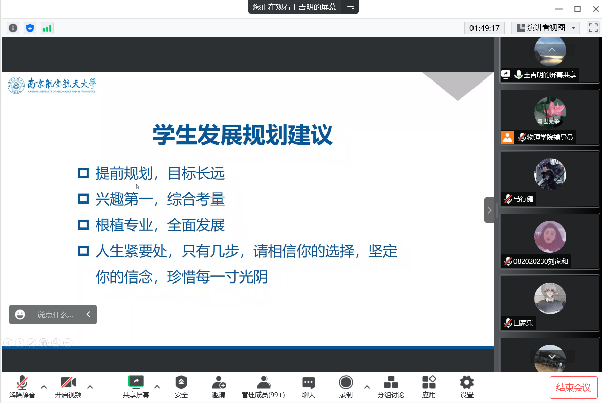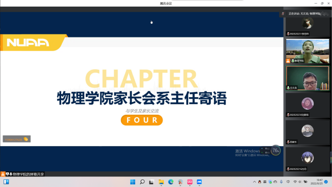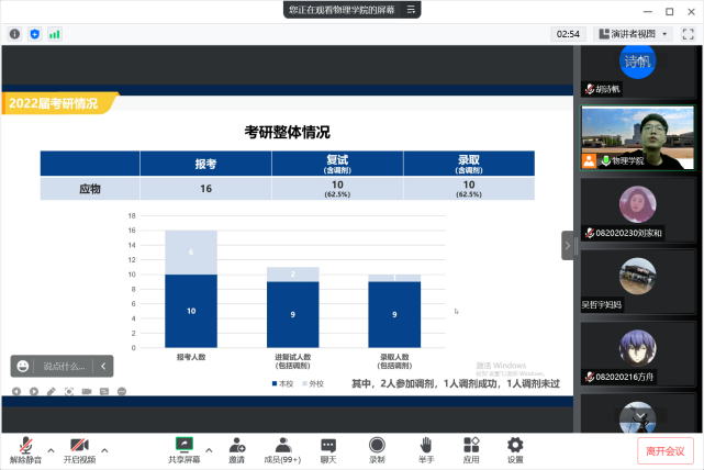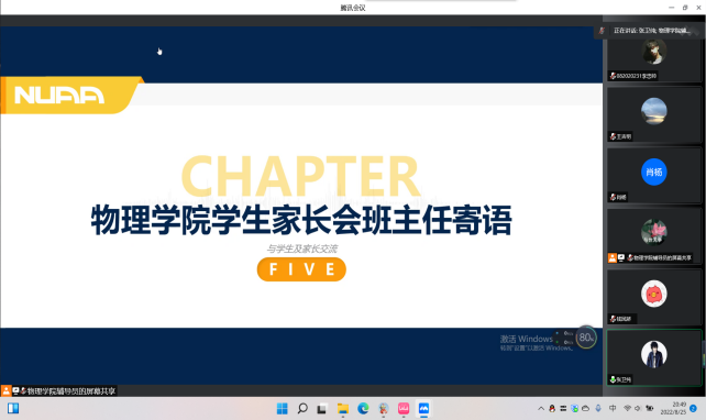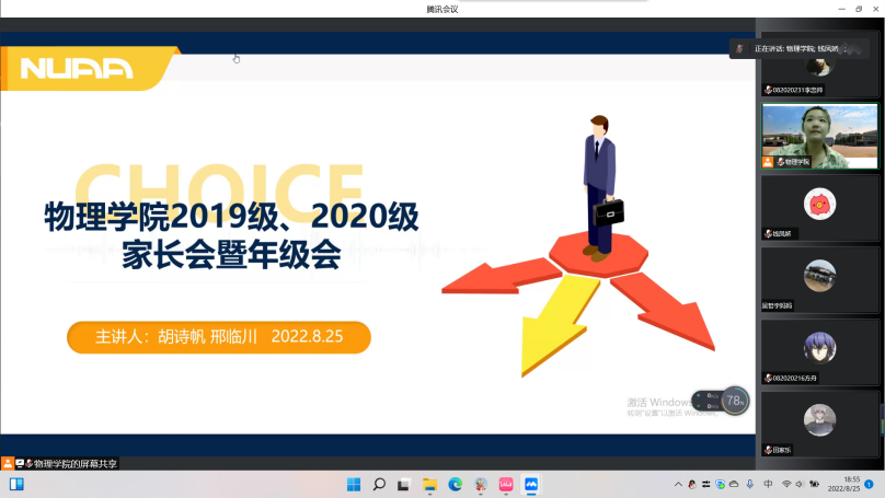 新学期开学前夕,为加强家校合作,有针对性地解答各阶段学生及家长关心关切问题,共促学生成长成才,物理学院召开了2019级、2020级线上家长会暨年级会,共计129位家长参会,覆盖全体学生家庭。物理系主任尤文龙,应用物理系主任王吉明,班主任肖杨、张卫纯、徐峰、钱凤娇参会,并与学生、家长交流。辅导员胡诗帆和邢临川主持。