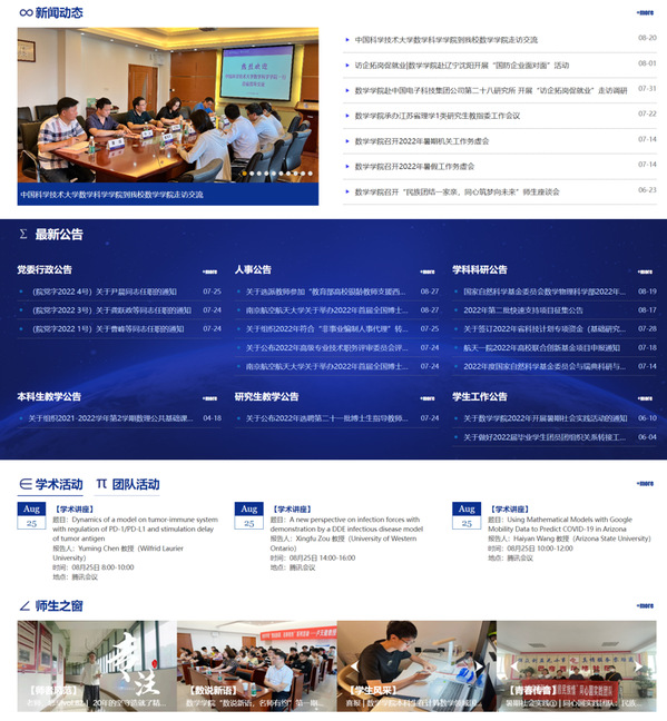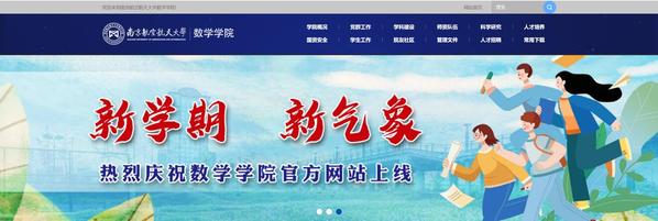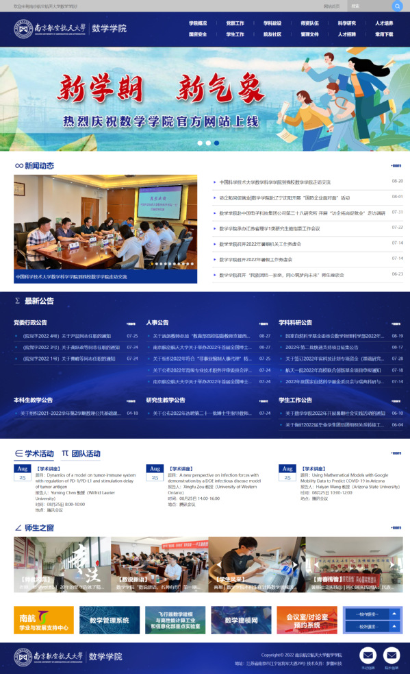 数学学院官方网站(http://math.nuaa.edu.cn)主色调为南航蓝,与学校网站构成统一体系。通过蓝色渐变与星球和星光融合的方式展现深邃与浩瀚的星辰大海风格,与学校“三航”特色相呼应。