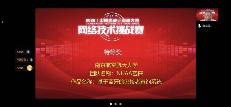 9月3日,2022“中国高校计算机大赛-网络技术挑战赛”决赛答辩评审在线上举行,来自清华大学、电子科技大学、哈尔滨工业大学、南京航空航天大学等高校的219支队伍分别在五大赛道展开紧张激烈的角逐,计算机学院“NUAA密探”队斩获大赛A(创新创意)赛项唯一特等奖,“CAN安全可以”队获大赛A-ST(创新创意-网络安全)赛项二等奖,赵彦超、韩皓老师获评优秀指导教师。线上颁奖仪式于9月4日晚举行。