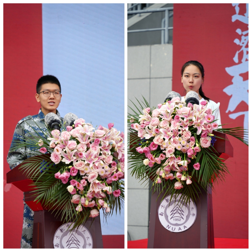 高考成绩672分的本科新生罗文焯和第一位在天目湖校区报到的研究生新生冯皓月作为新生代表,表达了他们成为新通飞人的喜悦,和对未来生活的憧憬。