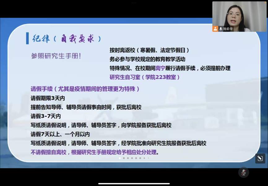 施俞辛首先详细介绍了研究生两年半的学业安排、信息自主获取途径、学业研究水平提升途径,并将研究生学习过程划分为短期目标和长期目标,为大家深刻剖析了提升自我的途径,为研究生新生的学习道路指明了方向。她从宿舍安全、疫情防控管理及规章制度等三个方面对同学们提出了要求,并特别强调了疫情期间,学生落实各项行为准则的必要性。