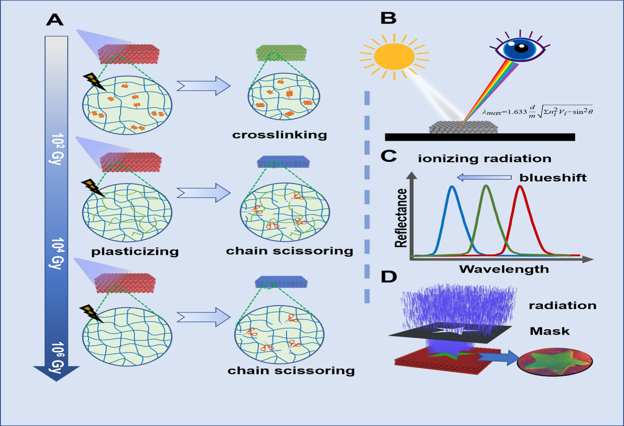 近日,材料科学与技术学院王运龙博士、马骏教授,中国科学技术大学汪谟贞副教授,苏州大学王殳凹教授等合作在Cell Press细胞出版社期刊Matter在线发表了一篇题为“Color-phase Readout Radiochromic Photonic Crystal Dosimeter”的研究论文,提出一种基于光子晶体结构色变化的全新辐射剂量计概念,并采用多种光子晶体进行了概念验证,获得了不同灵敏度的剂量计,有望应用于辐射加工、大科学装置束流校准与放射医学剂量验证等领域。该论文我院博士生王志浩为第一作者, 中国科学技术大学高分子科学与工程系博士生葛志青为共同第一作者,王运龙博士为通讯作者兼共同第一作者,马骏教授与王殳凹教授为共同通讯作者。