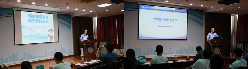 瑞金路派出所民警陈宇翔和张祥生分别向新生进行了反诈骗安全教育、大学生户籍管理工作教育,为新同学的人身财产安全保驾护航。