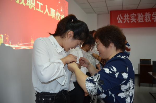 教学部今年面向社会共招聘6位专职实验教师。新教职工入职仪式环节,四位荣休教师为六位新入职教职工佩戴校徽,代表新一代老师接过接力棒,传递教书育人精神,实现立德树人根本任务。