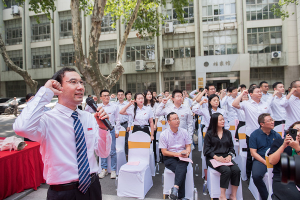 李南为新进教师代表、机电学院孟凯老师佩戴校徽。孟凯带领全体新进教师进行了庄严的入职宣誓,表达了他们奉献教书育人事业、服务学校事业发展的坚定决心。