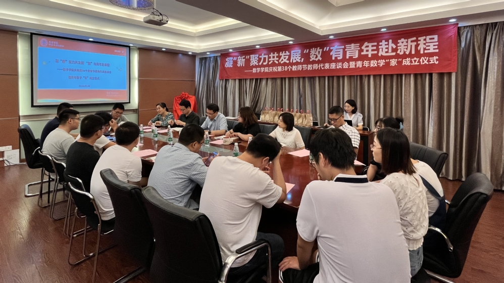 9月8日,数学学院庆祝第38个教师节教师代表座谈会暨青年数学“家”成立仪式在理学楼517召开,数学学院党委书记许静、院长王春武、党委副书记周佼佼、院长助理韩薇、龚跃政、潘茂东、吴健以及十余名青年教师参加了本次活动,活动由副院长徐江主持。