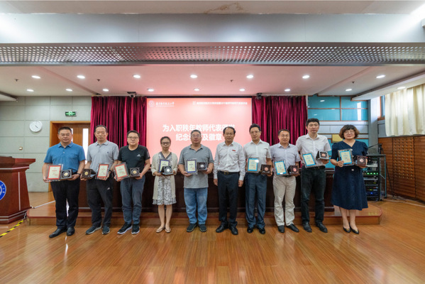 单忠德为入职30周年、20周年、10周年的教师代表颁发纪念证书和纪念徽章。