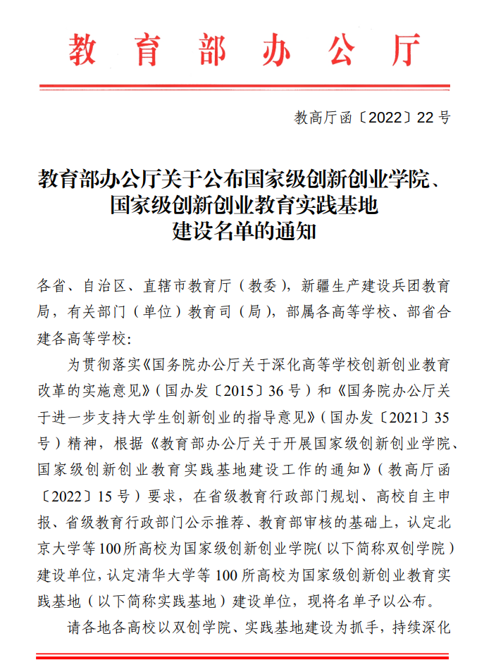 近日,教育部公布国家级创新创业学院及创新创业教育实践基地建设单位名单,经自主申报、专家评审、省厅推荐等程序,我校成功入选国家级创新创业学院建设单位。