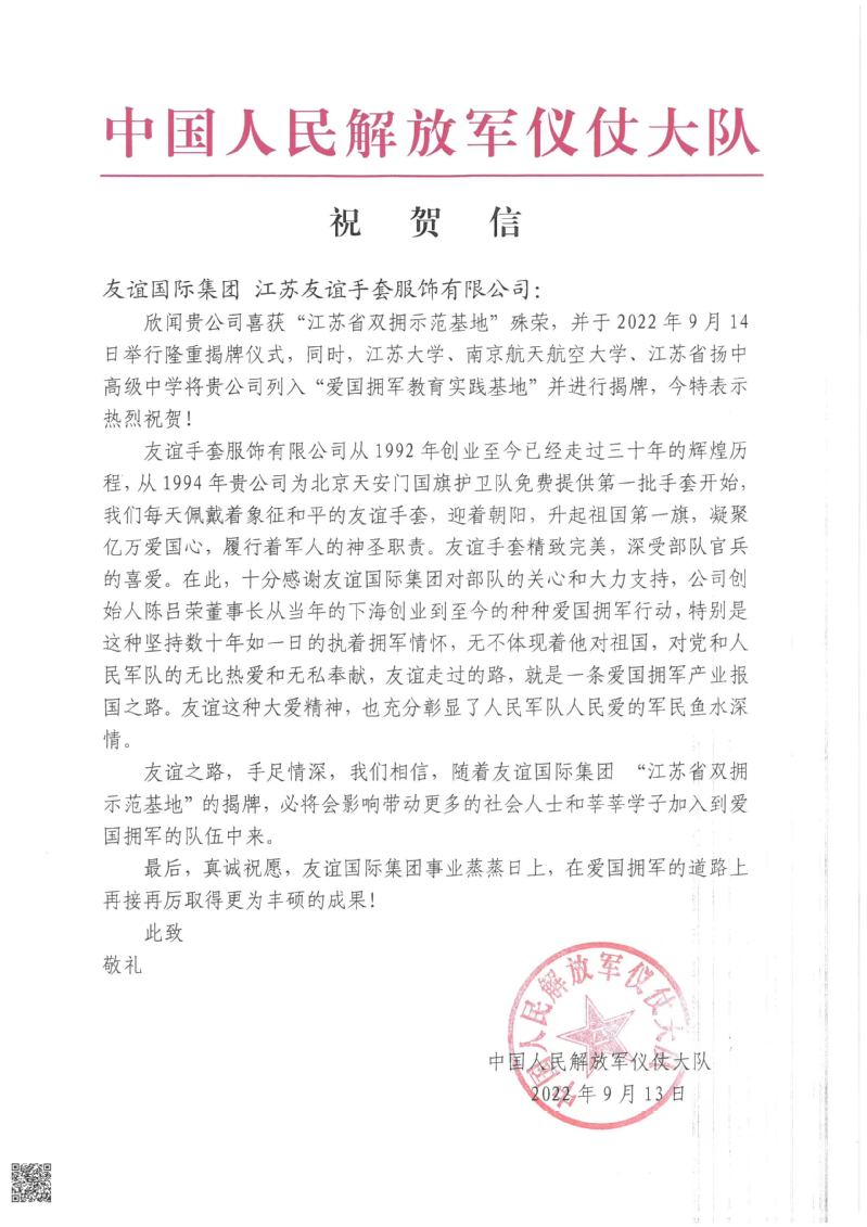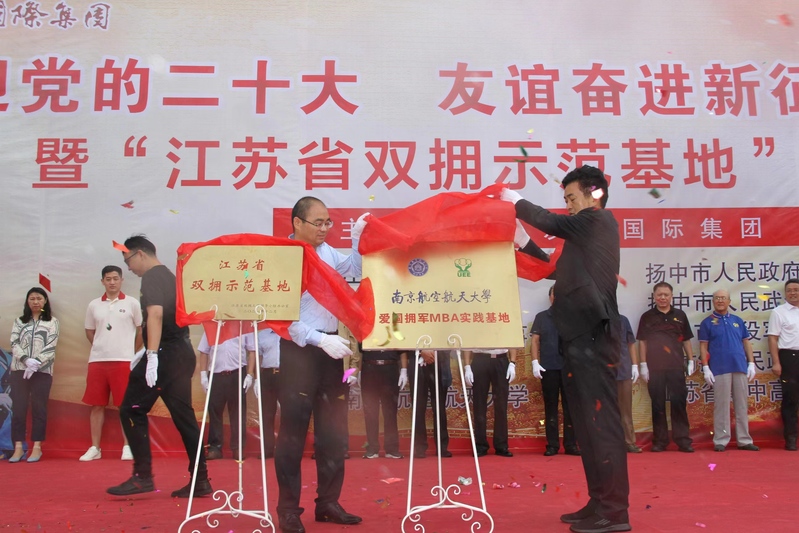 友谊国际集团被江苏省双拥办授予江苏省双拥示范基地,被南京航空航天大学经济与管理学院授予爱国拥军MBA实践基地。中国人民解放军仪仗大队专程为本次活动发来祝贺信。